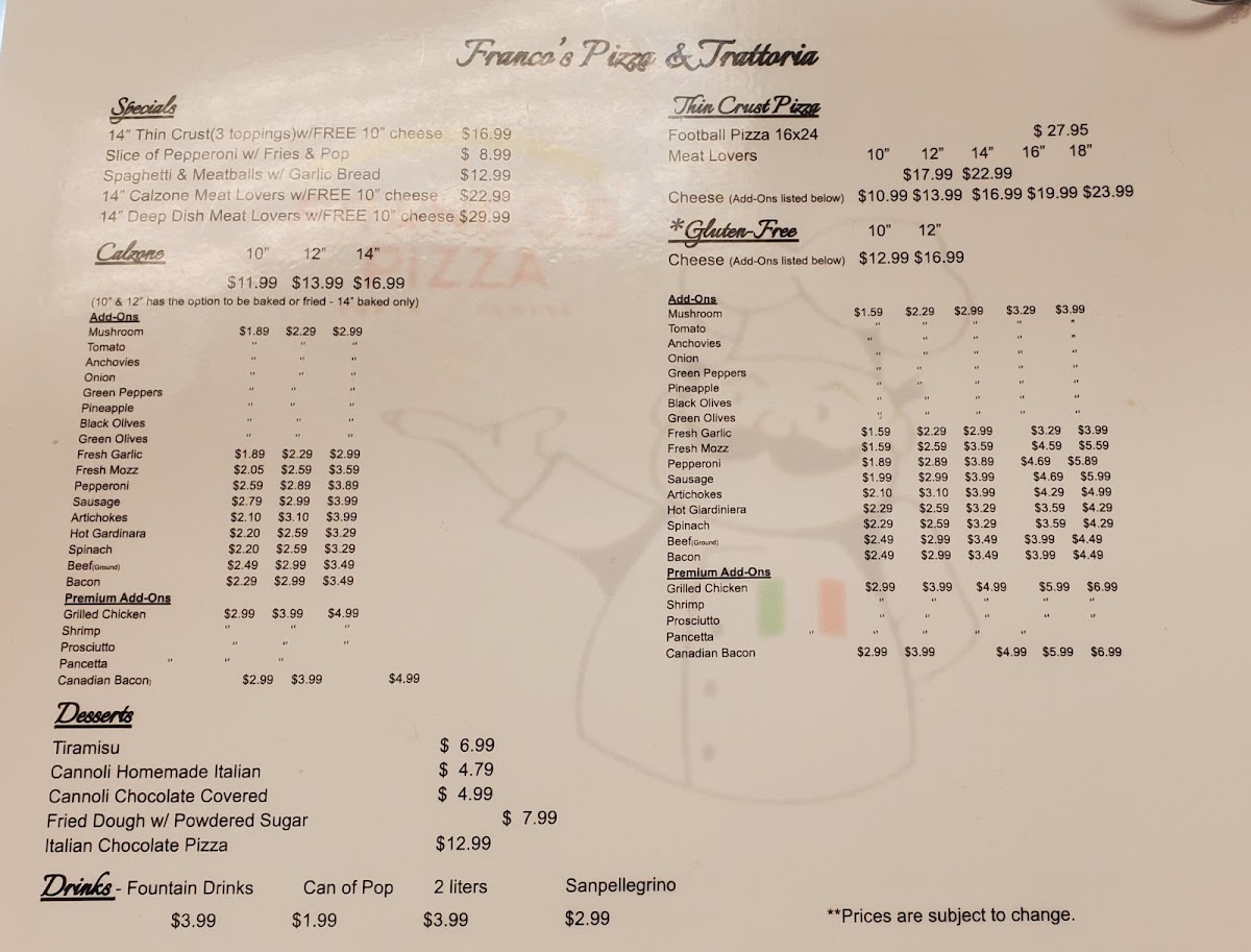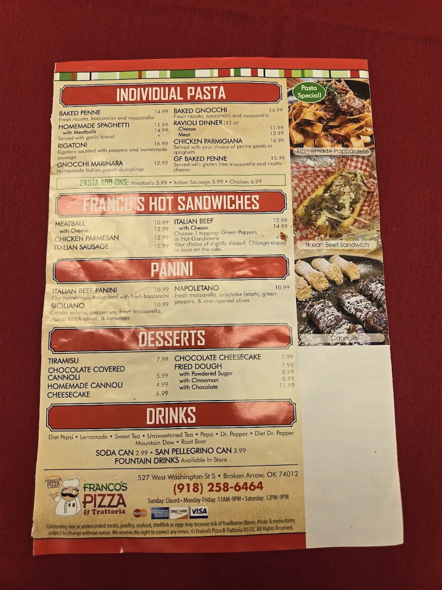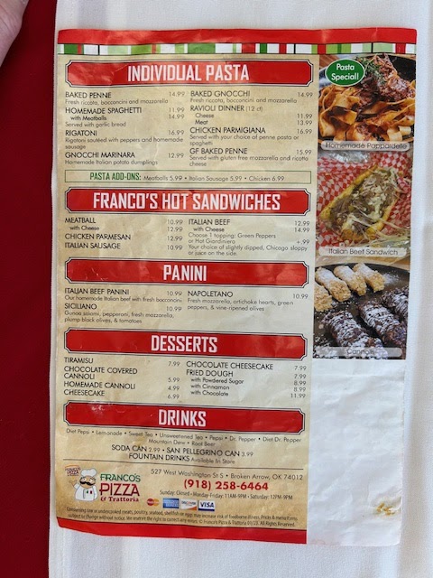 Welcome to Franco's Pizza & Trattoria, located at 527 West Washington St S in Broken Arrow, OK. This delightful eatery invites you to indulge in their mouthwatering menu, which is all about quality and flavor.